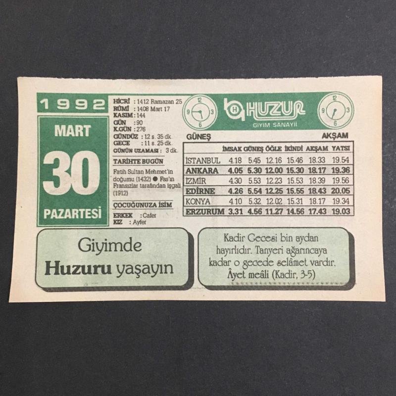 30 MART 1992 -TAKVİM YAPRAĞI-DOĞUM GÜNÜ HEDİYESİ-HUZUR TAKVİMİ,FATİHİN DOĞUMU 1432,FASIN FRANSIZLAR TARAFINDAN İŞGALİ 1912,ÇOCUĞUNUZA İSİM,BEDBAHTLAR ATEŞE GİDER,NE MUTLU,ŞİİR,İFTAR SOFRASI başlıklı ürün, Efemera, Müzik, Sinema > Belge ve Evraklar > Takvimler kategorisi altında İkinci El olarak satılmaktadır.