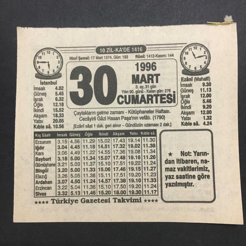 30 MART 1996 -TAKVİM YAPRAĞI-DOĞUM GÜNÜ HEDİYESİ-TÜRKİYE GAZETESİ TAKVİMİ,ÇAYLAKLARIN GELME ZAMANI,KÜTÜPHANELER HAFTASI,CEZAYİRLİ GAZİ HASAN PAŞANIN VEFATI 1790,DÜNYADA İLK ÜNİVERSİTE, en son 8 ay önce güncellenmiştir.