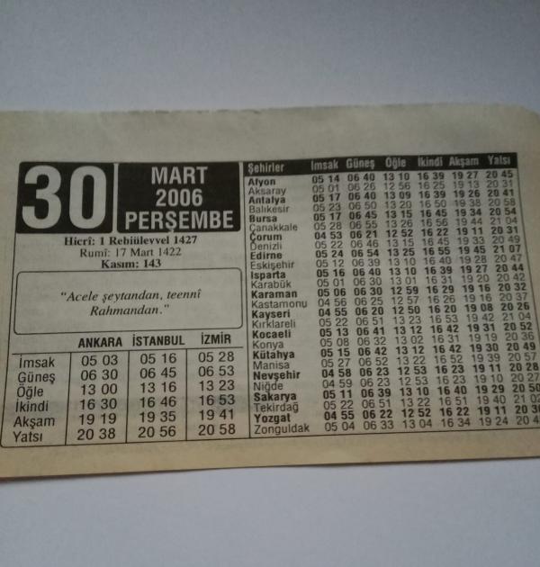 30 Mart 2006-Orijinal Takvim Yaprağı-Doğum Günü-Söz,Nişan,Nikâh,Düğün ve Önemli Günler Hediyesi-ERAŞ Hizmet Takvimi-Ayet-Hadis(Acele Şeytandan teenni Rahmandan)-Güneş Yanıkları-Çocuğunuza İsim:Veli,Vicdan, en son 3 ay önce güncellenmiştir.