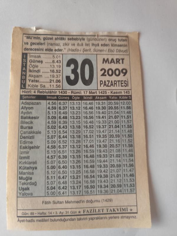 30 Mart 2009-Orijinal Takvim Yaprağı-Doğum Günü-Söz,Nişan,Nikâh,Düğün ve Önemli Günler Hediyesi-Fazilet Takvimi-Ayet(Hadis)(Hadis-i Şerif, Sünen-i Ebu Davud)-Fatih Sultan Mehmed'in Doğumu(1429)-Muaşeret Adabı-Fatih Sultan Mehmed Han'ın Doğumu, en son 23 gün önce güncellenmiştir.