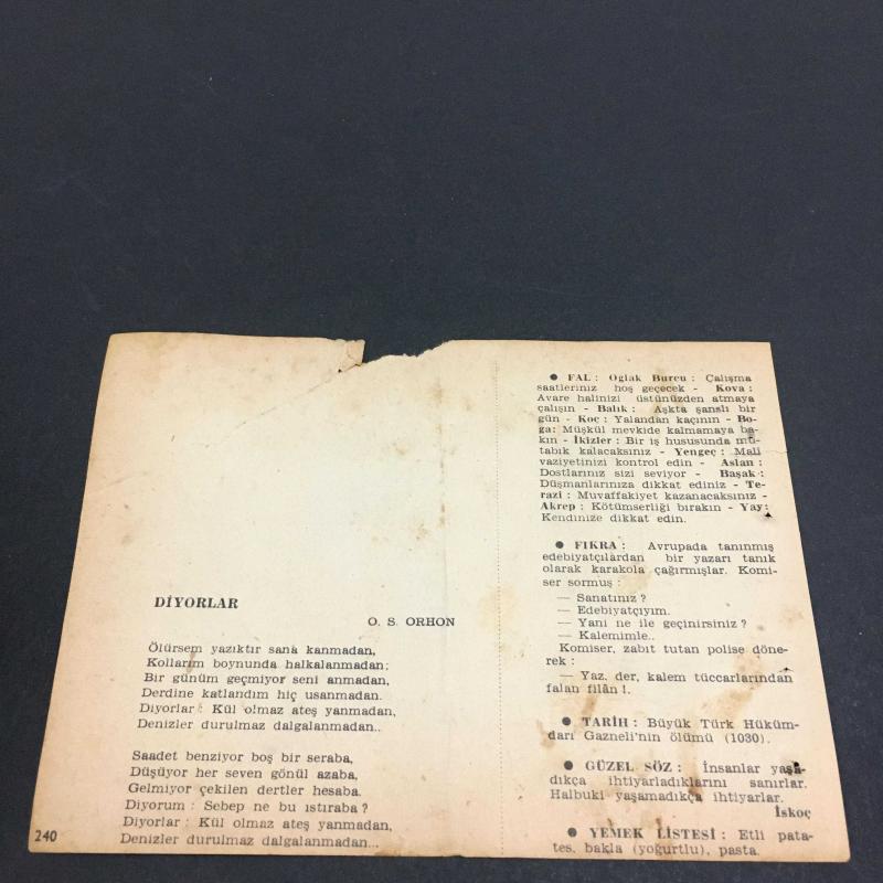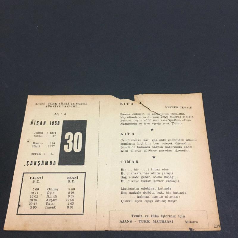 30 NİSAN 1958 -TAKVİM YAPRAĞI-DOĞUM GÜNÜ HEDİYESİ- AJANS-TÜRK ŞİİRLİ VE SAATLİ TÜRKİYE TAKVİMİ,NEYZEN TEVFİK,O.S.ORHON,FAL,FIKRA,GAZNELİNİN ÖLÜMÜ 1030,GÜZEL SÖZ,YEMEK LİSTESİ, 1 yıl önce satışa sunulmuştur.