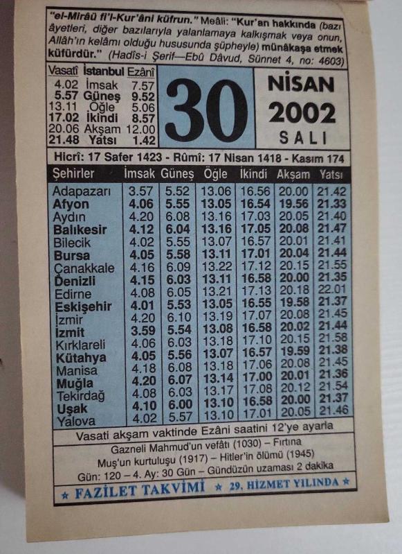30 NİSAN 2002 SALI- TAKVİM YAPRAĞI - DOĞUM GÜNÜ HEDİYESİ - FAZİLET TAKVİMİ -GAZNELİ MAHMUD'UN VEFATI (1030)-MUŞ'UN KURTULUŞU (1917)-HİTLER'İN ÖLÜMÜ (1945)-MÜNAZARA YAHUT ''TARTIŞMA'', en son 7 ay önce güncellenmiştir.