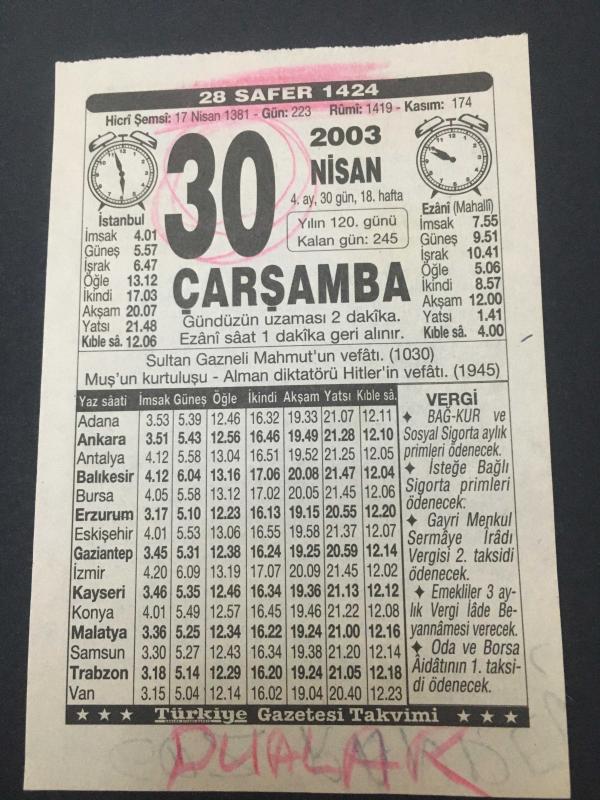 30 NİSAN 2003 -TAKVİM YAPRAĞI-DOĞUM GÜNÜ HEDİYESİ,TÜRKİYE GAZETESİ TAKVİMİ,GAZNELİ MAHMUTUN VEFATI,1030,MUŞUN KURTULUŞU,HİTLERİN VEFATI 1945,CANLI PUSULALAR, en son 8 ay önce güncellenmiştir.