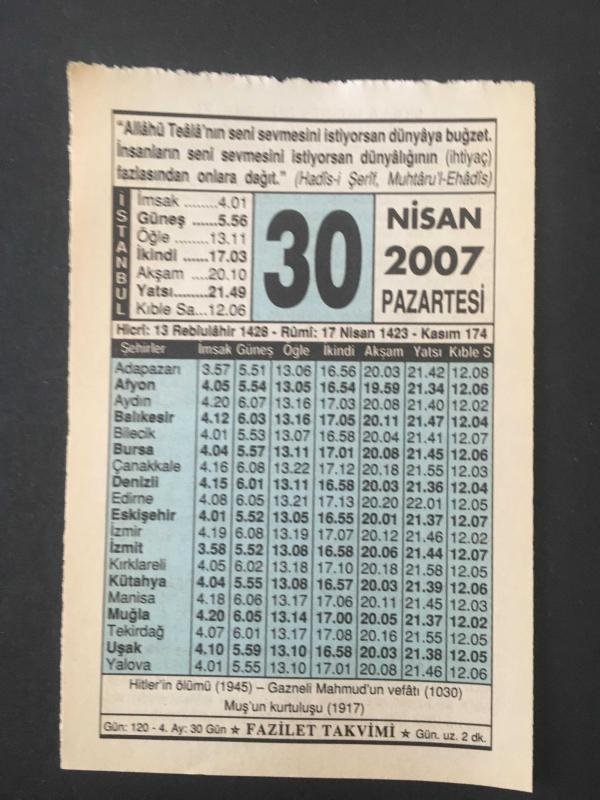30 NİSAN 2007 -TAKVİM YAPRAĞI-DOĞUM GÜNÜ HEDİYESİ-FAZİLET TAKVİMİ,HİTLERİN ÖLÜMÜ 1945,GAZNELİ MAHMUD UN VEFATI 1030,MUŞ UN KURTULUŞU 1917,DİLİN NİMET VE AFETLERİ başlıklı ürün, Efemera, Müzik, Sinema > Belge ve Evraklar > Takvimler kategorisi altında İkinci El olarak satılmaktadır.
