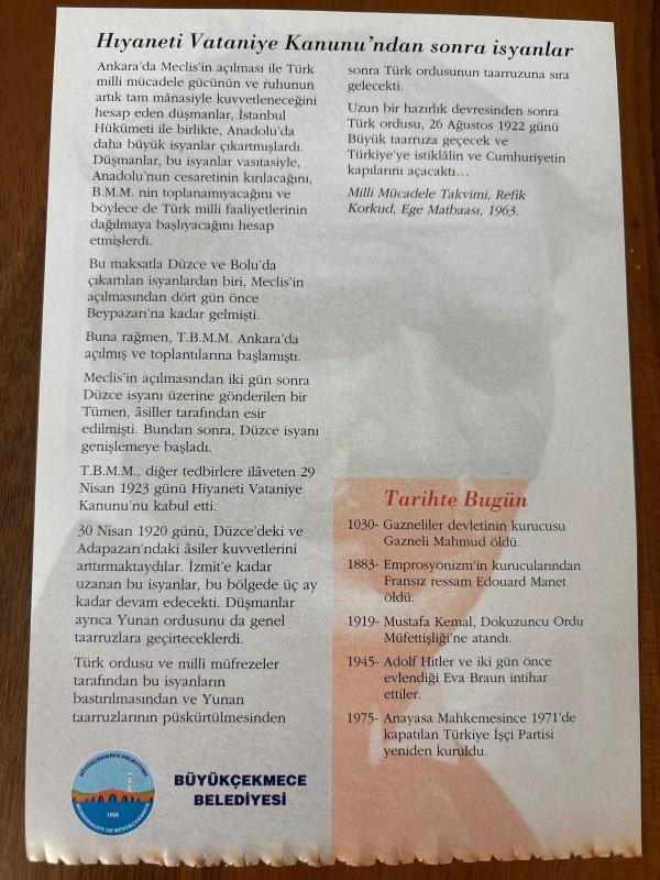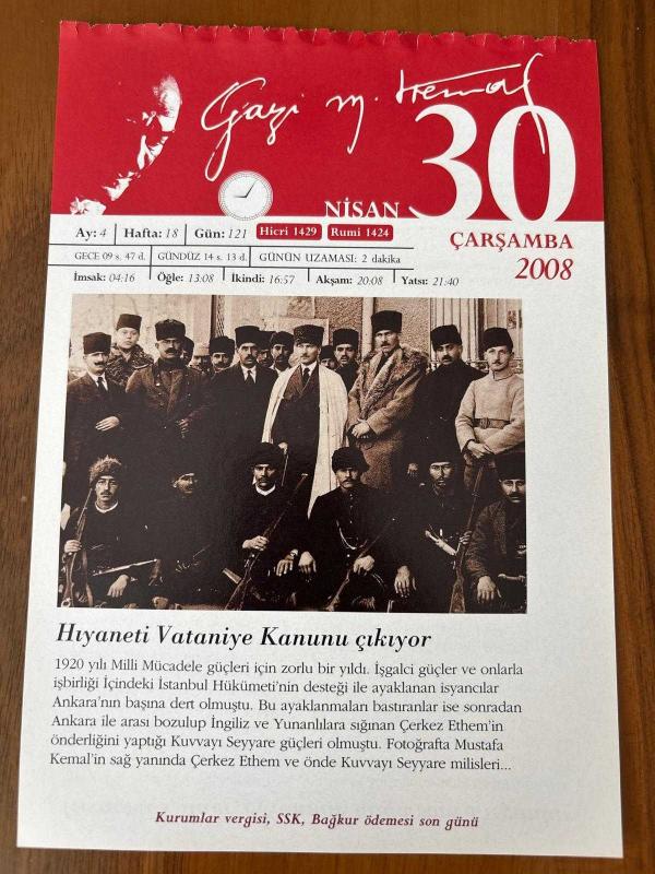 30 NİSAN 2008 - TAKVİM YAPRAĞI - DOĞUM GÜNÜ HEDİYESİ - GAZİ MUSTAFA KEMAL ATATÜRK FOTOĞRAFLI BÜYÜKÇEKMECE BELEDİYESİ TAKVİMİ - Hıyaneti Vataniye Kanunu çıkıyor - Hıyaneti Vataniye Kanunu'ndan sonra isyanlar - 1030- Gazneliler devletinin kurucusu Gazneli Mahmud öldü - 1883- Emprosyonizm'in kurucularından Fransız ressam Edouard Manet öldü - 1919- Mustafa Kemal, Dokuzuncu Ordu Müfettişliği'ne atandı - 1945- Adolf Hitler ve iki gün önce evlendiği Eva Braun intihar ettiler - 1975- Anayasa Mahkemesince 1971'de kapatılan Türkiye İşçi Partisi yeniden kuruldu, 3 ay önce satışa sunulmuştur.