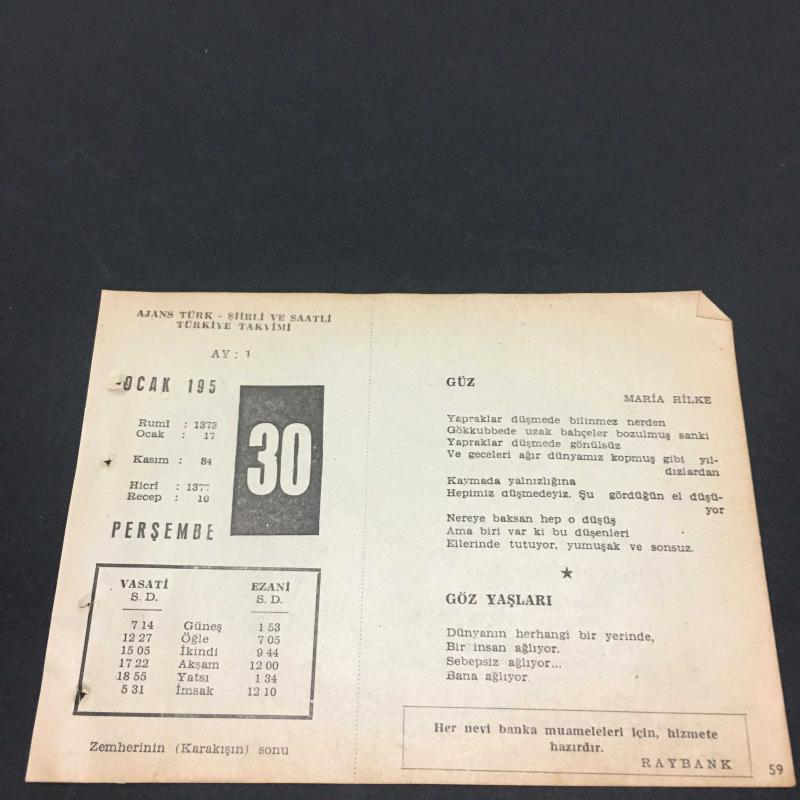 30 OCAK 1958-TAKVİM YAPRAĞI-DOĞUM GÜNÜ HEDİYESİ-AJANS TÜRK-ŞİİRLİ VE SAATLİ TÜRKİYE TAKVİMİ,MARİA RİLKE,PETÖFİ ŞANDOR,FAL,FIKRA,GANDİNİN ÖLÜMÜ 1948,GÜZEL SÖZ,YEMEK LİSTESİ, en son 8 ay önce güncellenmiştir.