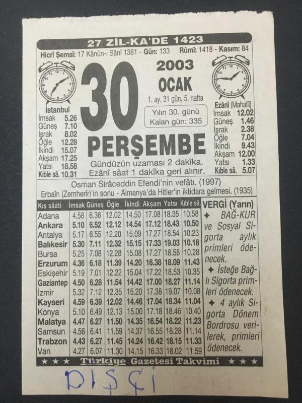 30 OCAK 2003-TAKVİM YAPRAĞI-DOĞUM GÜNÜ HEDİYESİ-TÜRKİYE GAZETESİ TAKVİMİ,OSMAN SİRACEDDİN EFENDİNİN VEFATI 1997,ALMANYADA HİTLRİRİN İKTİDARA GELMESİ,İHLAS VAKFI, 1 yıl önce satışa sunulmuştur.
