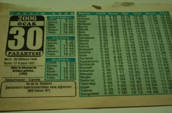 30 Ocak 2006-Orijinal Takvim Yaprağı-Doğum Günü-Söz,Nişan,Nikâh,Düğün ve Önemli Günler Hediyesi-Bizim Anadolu Takvimleri-Ayet-Hadis(Mü'minun:97)(Hitler'in Almanya'da iktidara gelmesi(1932))-Abdulmecid,Cahide-Doğada Yaşam, en son 2 ay önce güncellenmiştir.