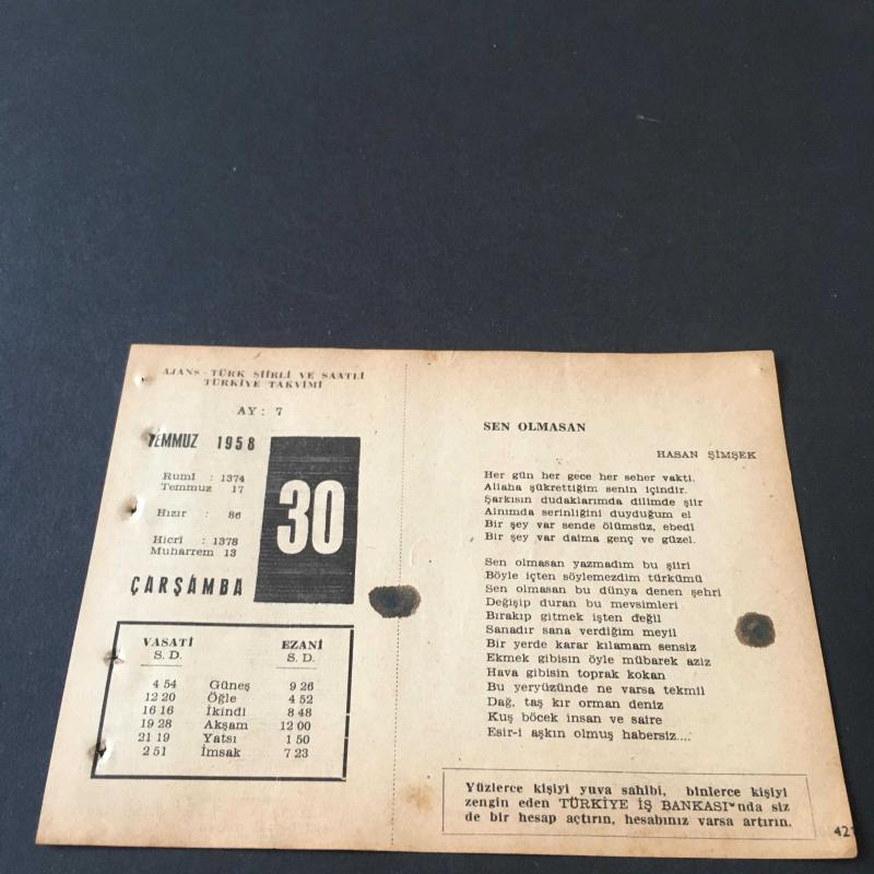 30 TEMMUZ 1958 -TAKVİM YAPRAĞI-DOĞUM GÜNÜ HEDİYESİ-AJANS-TÜRK ŞİİRLİ VE SAATLİ TÜRKİYE TAKVİMİ,HASAN ŞİMŞEK,N.F.AKINCI,FAL,FIKRA,FRANSIZ BESTECİSİ CHAPTALE NİN ÖLÜMÜ 1832,GÜZEL SÖZ,YEMEK LİSTESİ, en son 8 ay önce güncellenmiştir.
