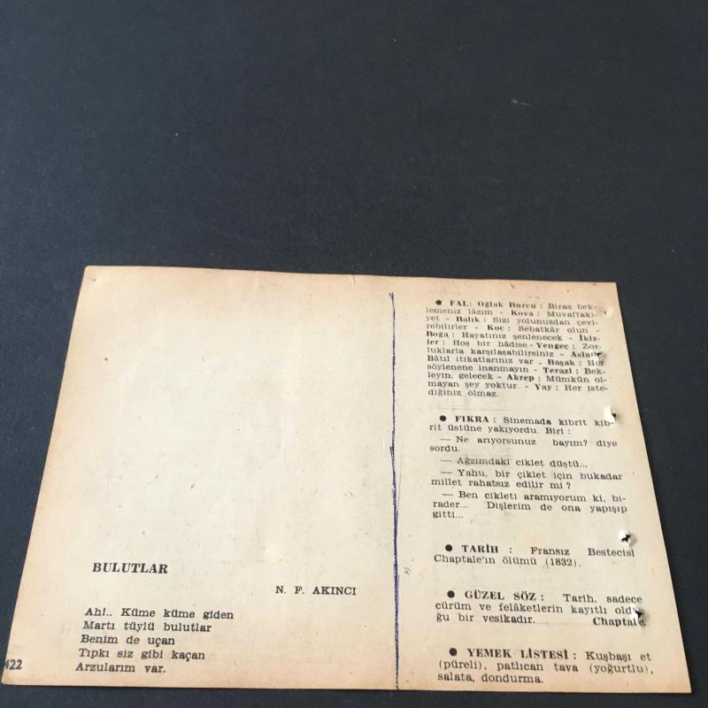 30 TEMMUZ 1958 -TAKVİM YAPRAĞI-DOĞUM GÜNÜ HEDİYESİ-AJANS-TÜRK ŞİİRLİ VE SAATLİ TÜRKİYE TAKVİMİ,HASAN ŞİMŞEK,N.F.AKINCI,FAL,FIKRA,FRANSIZ BESTECİSİ CHAPTALE NİN ÖLÜMÜ 1832,GÜZEL SÖZ,YEMEK LİSTESİ başlıklı ürün, Efemera, Müzik, Sinema > Belge ve Evraklar > Takvimler kategorisi altında İkinci El olarak satılmaktadır.
