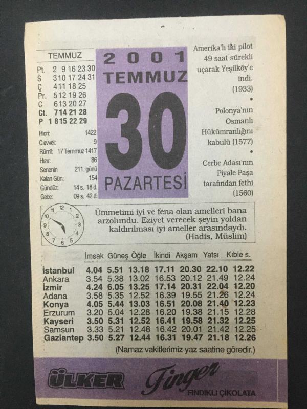 30 TEMMUZ 2001-TAKVİM YAPRAĞI-DOĞUM GÜNÜ HEDİYESİ-ÜLKER TAKVİMİ,AMERİKALI 2 PİLOT SÜREKLİ UÇARAK YEŞİLKÖYE İNDİ 1933,POLANYANIN OSMANLI HÜKÜMDARLIĞINI KABULÜ,1577,CERBE ADASININ PİYALE PAŞA TARAFINDAN FETHİ 1560,TELEFONLA KONUŞMA başlıklı ürün, Efemera, Müzik, Sinema > Belge ve Evraklar > Takvimler kategorisi altında İkinci El olarak satılmaktadır.