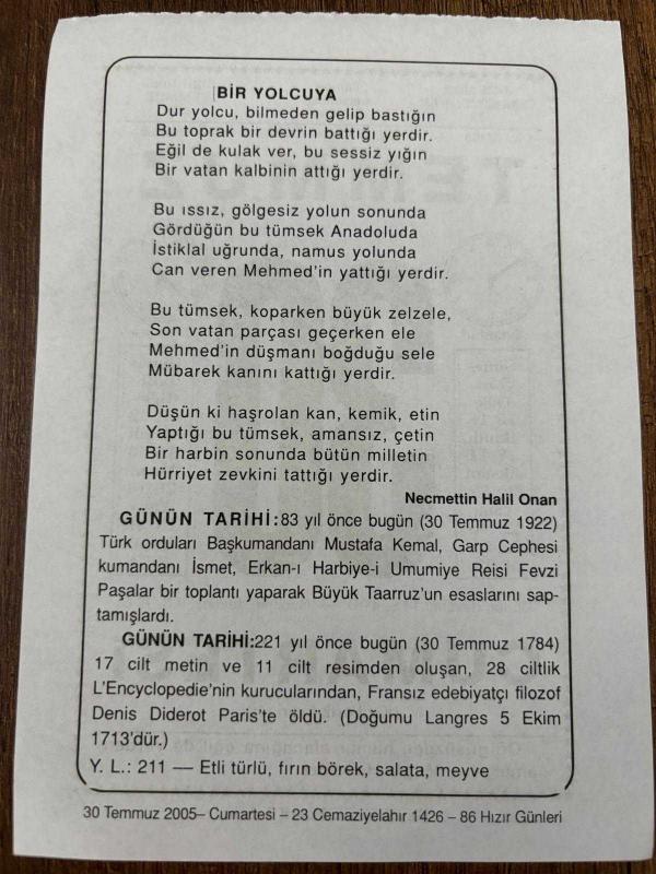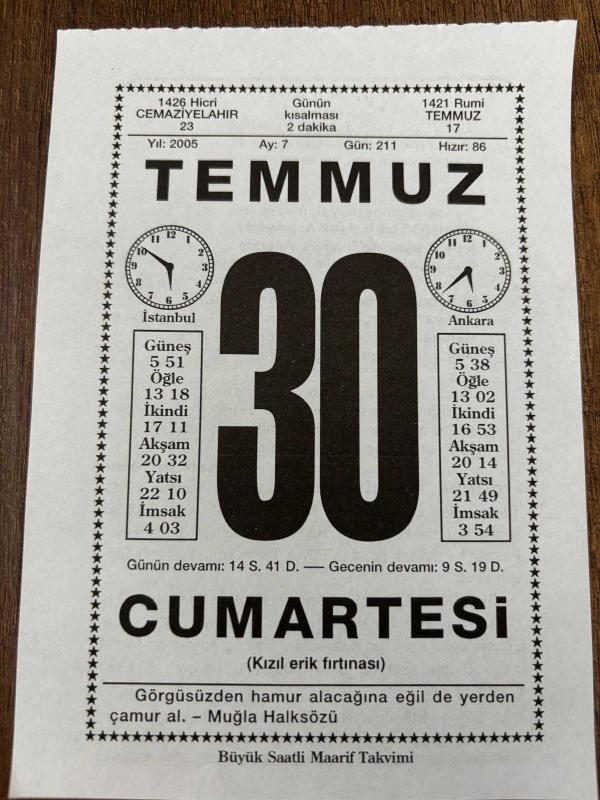 30 TEMMUZ 2005 - TAKVİM YAPRAĞI - DOĞUM GÜNÜ HEDİYESİ - BÜYÜK SAATLİ MAARİF TAKVİMİ - MUĞLA HALKSÖZÜ - NECMETTİN HALİL ONAN - BAŞKUMANDAN MUSTAFA KEMAL VE SİLAH ARKADAŞLARI TOPLATI YAPARAK BÜYÜK TAARUZUN ESASLARINI ÇIKARDILAR - FRANSIZ EDEBİYATÇI DENİS DİDEROT ÖLDÜ, en son 8 ay önce güncellenmiştir.
