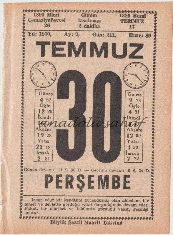 30 Temmuz 1970 / Büyük Saatli Maarif Takvimi