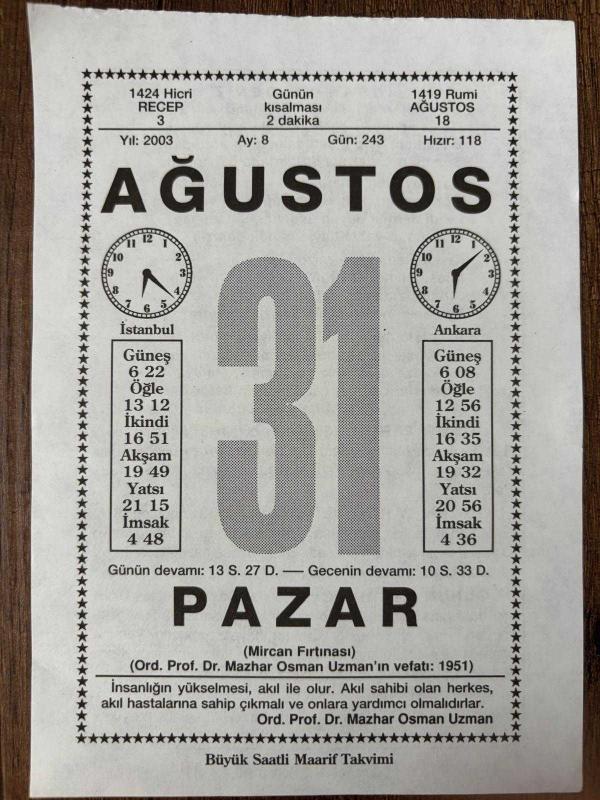 31 AĞUSTOS 2003 - TAKVİM YAPRAĞI - DOĞUM GÜNÜ HEDİYESİ - BÜYÜK SAATLİ MAARİF TAKVİMİ - ORD.PROF.DR. MAZHAR OSMAN UZMAN - ORHAN VELİ - FRANSIZ YAZAR CHARLES BAUDELAİRE ÖLDÜ - 2.ABDÜLHAMİD TAHTA ÇIKTI - ORD.PROF.DR. MAZHAR OSMAN UZMAN VEFAT ETTİ, en son 8 ay önce güncellenmiştir.