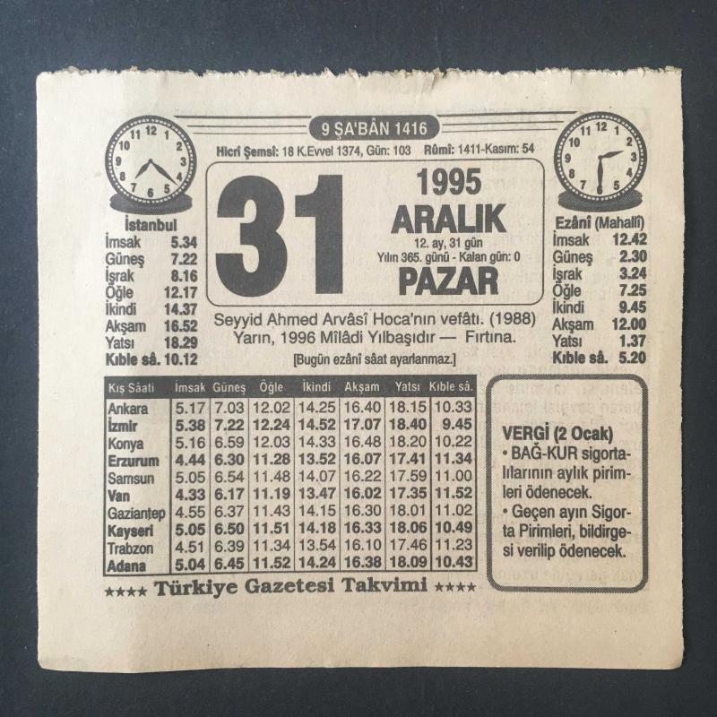31 ARALIK 1995 -TAKVİM YAPRAĞI-DOĞUM GÜNÜ HEDİYESİ-TÜRKİYE GAZETESİ TAKVİMİ,SEYYİD AHMED ARVASİ HOCANIN VEFATI 1988,YARIN 1996 MİLADİ YILBAŞIDIR,FIRTINA,BENİM SUÇUM NEYDİ, en son 8 ay önce güncellenmiştir.