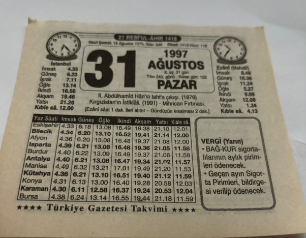 31 Ağustos 1997-Orijinal Takvim Yaprağı-Doğum Günü-Söz,Nişan,Nikâh,Düğün ve Önemli Günler Hediyesi-Türkiye Gazetesi Takvimi-Ayet,Hadis (Vergi)-II.Abdulhamid Han'ın Taht'a çıkışı(1876)-İhlas-Ocağım Söndü- Erkek:Ömer,Kız:Betül, en son 2 gün önce güncellenmiştir.