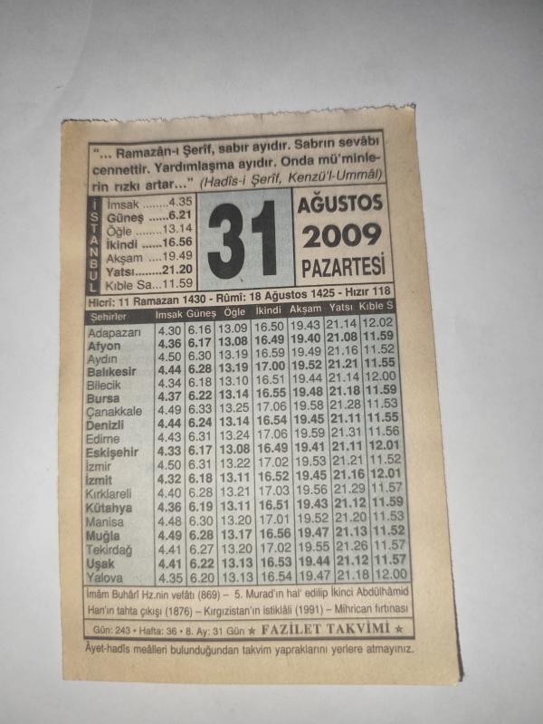 31 Ağustos 2009-Orijinal Takvim Yaprağı-Doğum Günü-Söz,Nişan,Nikâh,Düğün ve Önemli Günler Hediyesi-Fazilet Takvimi-Ayet(Hadis)(Hadis-i Şerif, Kenzü'l-Ummal)-İmam Buhari Hz.nin Vefatı (869)-İlme Saygı-Maruf İle Emir Nasıl Yapılır?, en son 24 gün önce güncellenmiştir.