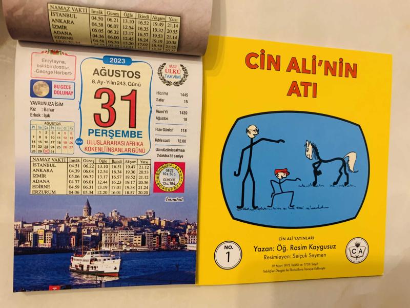 31 Ağustos 2023 hediyelik orijinal Ülkü takvim yaprağı (Cin Ali kitabı hediyeli:) başlıklı ürün, Efemera, Müzik, Sinema > Belge ve Evraklar > Takvimler kategorisi altında İkinci El olarak satılmaktadır.
