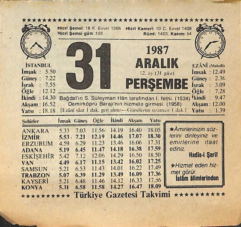 31 Aralık 1987 Takvim Yaprağı - Doğum Günü Hediyesi EFMN14980, en son 19 gün önce güncellenmiştir.