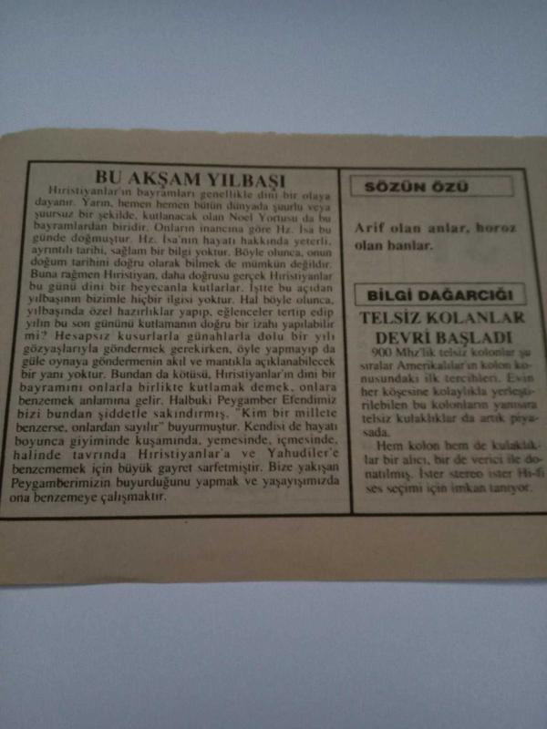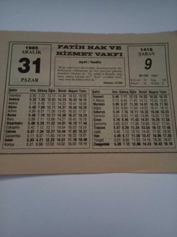 31 Aralık 1995-Orijinal Takvim Yaprağı-Doğum Günü-Söz,Nişan,Nikâh,Düğün ve Önemli Günler Hediyesi-Fatih Hak ve Hizmet Vakfı-Ayet/Hadis(Hakim:4/298)-Bu Akşam Yılbaşı-Sözün Özü-Telsiz Kolanlar Devri Başladı, 23 gün önce satışa sunulmuştur.