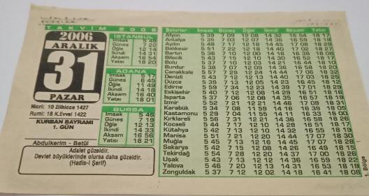 31 Aralık 2006-Orijinal Takvim Yaprağı-Doğum Günü-Söz,Nişan,Nikâh,Düğün ve Önemli Günler Hediyesi-Bizim Anadolu Takvimleri-Ayet(Hadis-i Şerif)-Kurban Bayramı 1.Gün-Abdulkerim,Betül-Kurban, en son 2 ay önce güncellenmiştir.