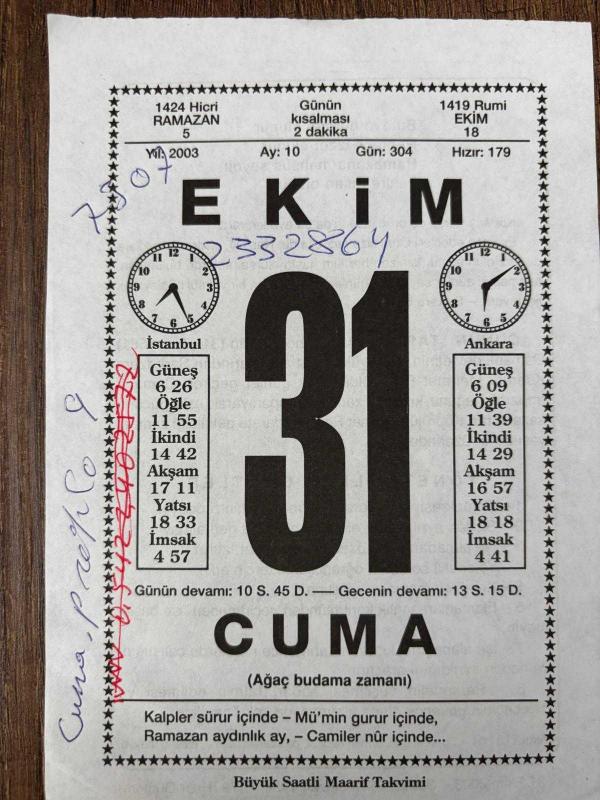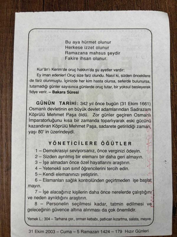 31 EKİM 2003 - TAKVİM YAPRAĞI - DOĞUM GÜNÜ HEDİYESİ - BÜYÜK SAATLİ MAARİF TAKVİMİ - BAKARA SURESİ - KÖPRÜLÜ MEHMET PAŞA ÖLDÜ - YÖNETİCİLERE ÖĞÜTLER, en son 8 ay önce güncellenmiştir.