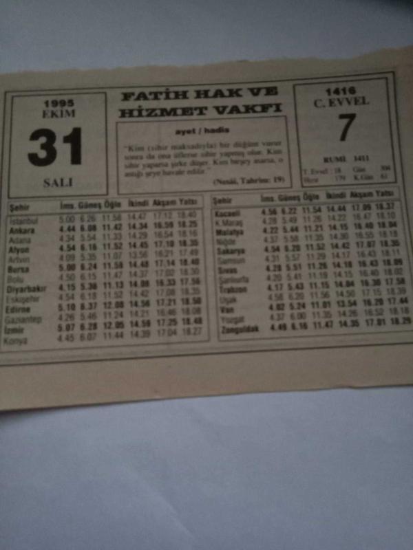 31 Ekim 1995-Orijinal Takvim Yaprağı-Doğum Günü-Söz,Nişan,Nikâh,Düğün ve Önemli Günler Hediyesi-Fatih Hak ve Hizmet Vakfı-Ayet/Hadis(Nesâi,Tahrim:19)-Faranjit Hastalığı -Sözün Özü-Neyzen, en son 4 ay önce güncellenmiştir.
