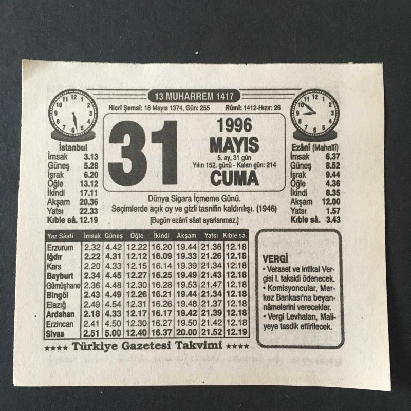 31 MAYIS 1996 -TAKVİM YAPRAĞI-DOĞUM GÜNÜ HEDİYESİ-TÜRKİYE GAZETESİ TAKVİMİ,DÜNYA SİGARA İÇMEME GÜNÜ,SEÇİMLERDE AÇIK OY GİZLİ TASNİFİN KALDIRILIŞI 1946,NAMAZIN VACİBLERİ, en son 8 ay önce güncellenmiştir.