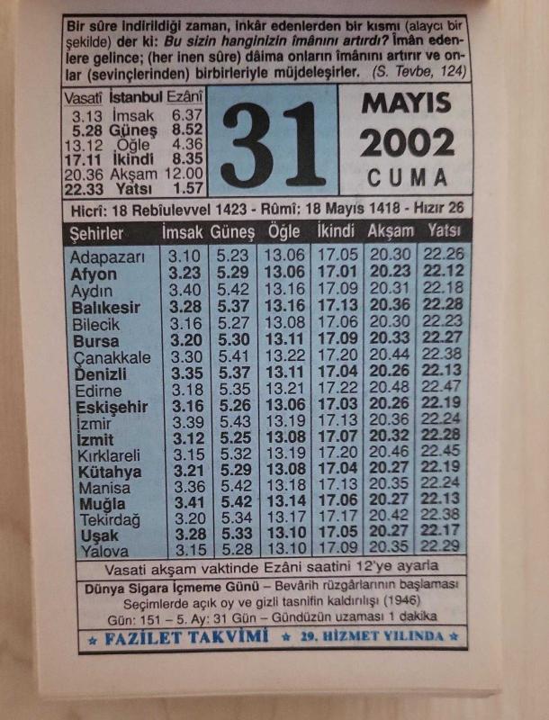 31 MAYIS 2002 CUMA- TAKVİM YAPRAĞI - DOĞUM GÜNÜ HEDİYESİ - FAZİLET TAKVİMİ -DÜNYA SİGARA İÇMEME GÜNÜ-SEÇİMLERDE AÇIK OY VE GİZLİ TASNİFİN KALDIRILIŞI (1946)-HIZIR BEY VE ''KASİDE-İ NUNİYE''Sİ, en son 6 ay önce güncellenmiştir.