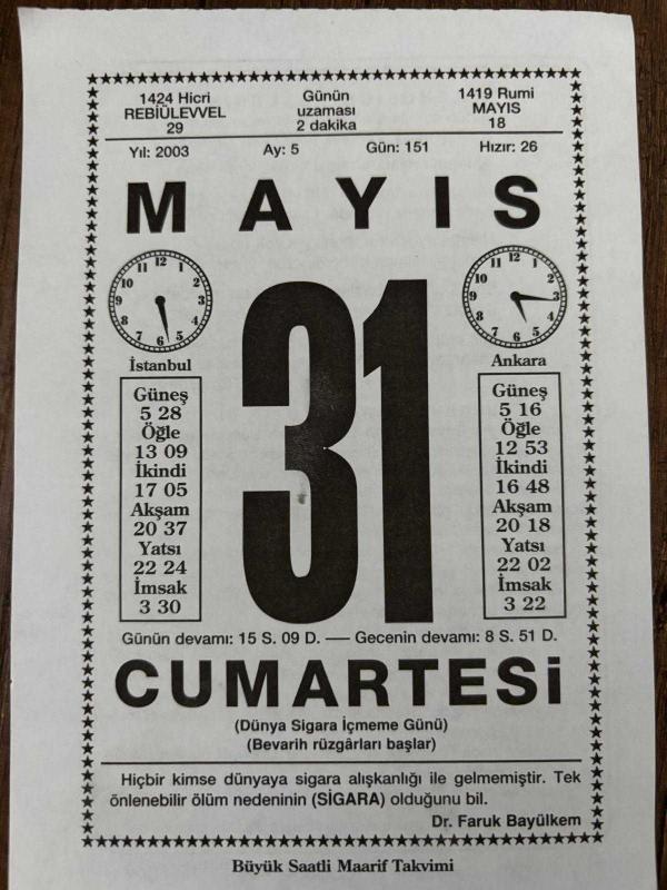 31 MAYIS 2003 - TAKVİM YAPRAĞI - DOĞUM GÜNÜ HEDİYESİ - BÜYÜK SAATLİ MAARİF TAKVİMİ - DR.FARUK BAYÜLKEM - PROF. DR. YILDIZ TÜMERDEM - BUGÜN SİGARADAN UZAK DURUN, en son 8 ay önce güncellenmiştir.