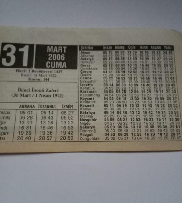 31 Mart 2006-Orijinal Takvim Yaprağı-Doğum Günü-Söz,Nişan,Nikâh,Düğün ve Önemli Günler Hediyesi-ERAŞ Hizmet Takvimi-Ayet-Hadis(İkinci İnönü Zaferi (31 Mart / 1 Nisan 1921)-Kanserden Korunma Yöntemleri-Çocuğunuza İsim:Volkan,Verda, en son 3 ay önce güncellenmiştir.
