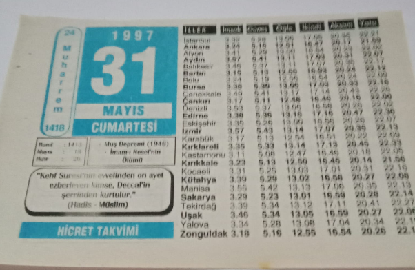 31 Mayıs 1997-Orijinal Takvim Yaprağı-Doğum Günü-Söz,Nişan,Nikâh,Düğün ve Önemli Günler Hediyesi-Hicret Takvimi-Ayet(Hadis)-(Hadis-Müslim)-Muş Depremı(1946)-İmam-ı Nesai ve Sünen-i, en son 23 gün önce güncellenmiştir.
