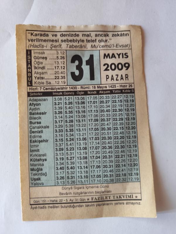31 Mayıs 2009-Orijinal Takvim Yaprağı-Doğum Günü-Söz,Nişan,Nikâh,Düğün ve Önemli Günler Hediyesi-Fazilet Takvimi-Ayet(Hadis)(Hadis-i Şerif, Taberani, Mu'cemü'l-Evsat )-Dünya Sigara İçmeme Günü ()-Zekatı Verilmeyen Mal Helak Olur-Arşın Gölgesindeki Yeni Sınıf başlıklı ürün, Efemera, Müzik, Sinema > Belge ve Evraklar > Takvimler kategorisi altında İkinci El olarak satılmaktadır.