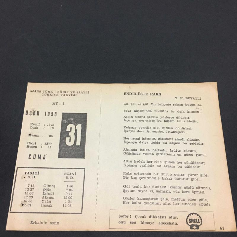 31 OCAK 1958-TAKVİM YAPRAĞI-DOĞUM GÜNÜ HEDİYESİ-AJANS TÜRK-ŞİİRLİ VE SAATLİ TÜRKİYE TAKVİMİ,Y.K.BEYATLI,NAHİD ULVİ,FAL,FIKRA,TÜRKİYEDE İLK MATBAANIN KURULUŞU,1729,RECAİZADE EKREMİN ÖLÜMÜ 1914,GÜZEL SÖZ,YEMEK LİSTESİ başlıklı ürün, Efemera, Müzik, Sinema > Belge ve Evraklar > Takvimler kategorisi altında İkinci El olarak satılmaktadır.