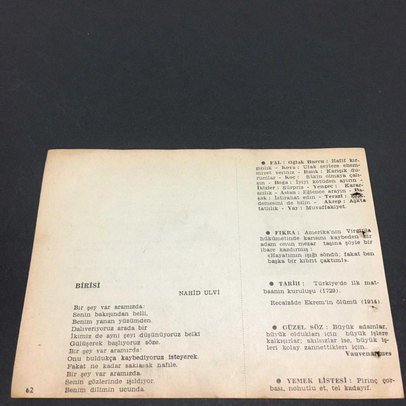 31 OCAK 1958-TAKVİM YAPRAĞI-DOĞUM GÜNÜ HEDİYESİ-AJANS TÜRK-ŞİİRLİ VE SAATLİ TÜRKİYE TAKVİMİ,Y.K.BEYATLI,NAHİD ULVİ,FAL,FIKRA,TÜRKİYEDE İLK MATBAANIN KURULUŞU,1729,RECAİZADE EKREMİN ÖLÜMÜ 1914,GÜZEL SÖZ,YEMEK LİSTESİ, en son 8 ay önce güncellenmiştir.
