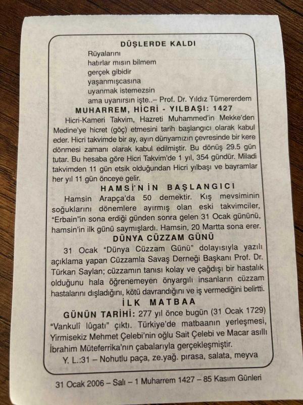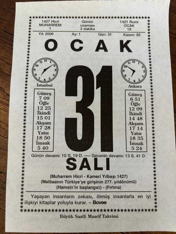 31 OCAK 2006 - TAKVİM YAPRAĞI - DOĞUM GÜNÜ HEDİYESİ - BÜYÜK SAATLİ MAARİF TAKVİMİ - BOVEE - PROF. DR. YILDIZ TÜMERDEM - HİCRİ YILBAŞI - HAMSİ'NİN BAŞLANGICI - DÜNYA CÜZZAM GÜNÜ - İLK MATBAA, 3 ay önce satışa sunulmuştur.