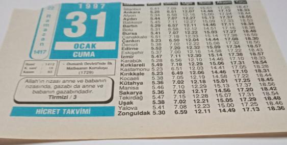 31 Ocak 1997-Orijinal Takvim Yaprağı-Doğum Günü-Söz,Nişan,Nikâh,Düğün ve Önemli Günler Hediyesi-Hicret Takvimi-Ayet(Hadis)-(Tirmizi:3)-Osmanlı Devleti'nde İlk Matbaanın Kuruluşu(1729)-Fıtır Sadakası-M.Akif, en son bir ay önce güncellenmiştir.