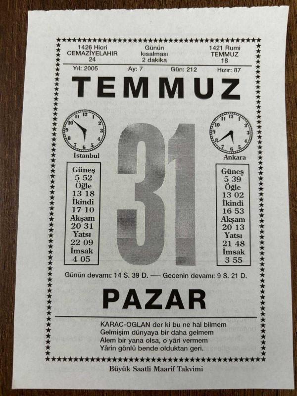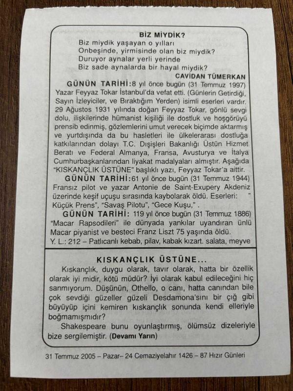 31 TEMMUZ 2005 - TAKVİM YAPRAĞI - DOĞUM GÜNÜ HEDİYESİ - BÜYÜK SAATLİ MAARİF TAKVİMİ - CAVİDAN TÜMERKAM - FRANSIZ PİLOT VE YAZAR ANTONİE DE SAİNT-EXUPERY AKDENİZ KEŞİF UÇUSU SIRASINDA KAYBOLARAK ÖLDÜ - MACAR PİYANİST FRANZ LİSZT ÖLDÜ, en son 8 ay önce güncellenmiştir.