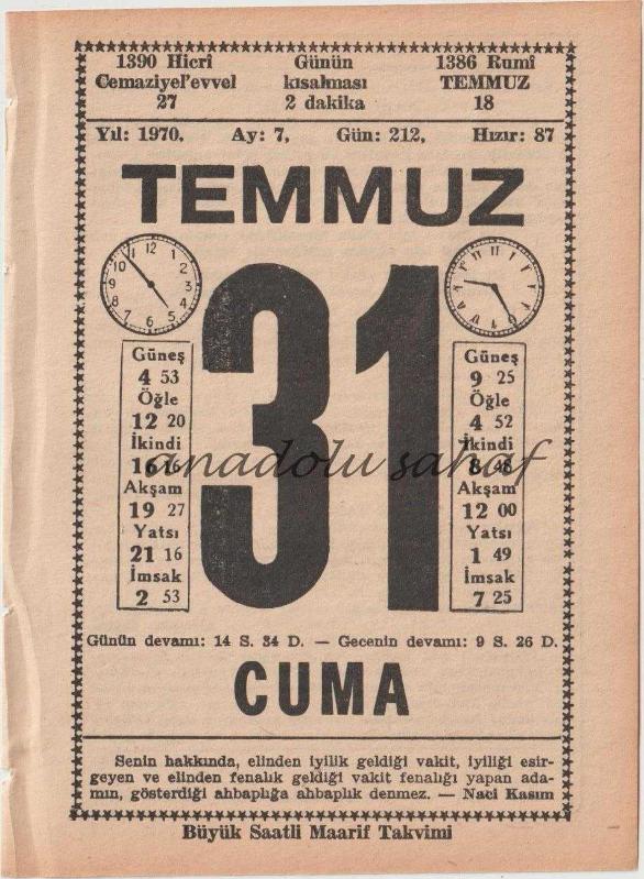 31 Temmuz 1970 / Büyük Saatli Maarif Takvimi