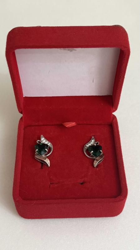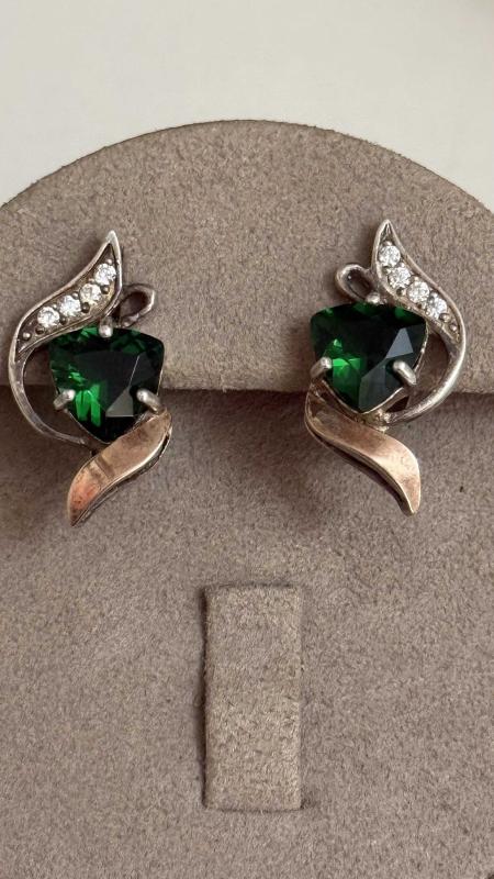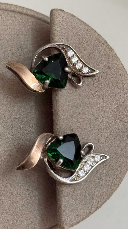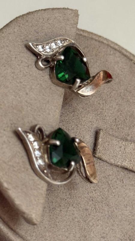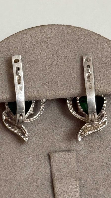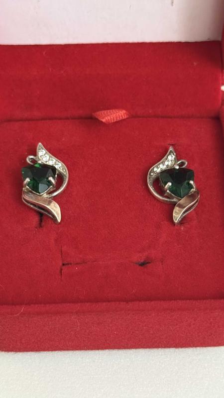 Wintega dönem İtalyan beyaz kısımlar gümüş 925 ayar sarı alt kısımlar 375 damgalı 9 ayar altın 3 beyaz taşlar pırlanta orta kısım dalı yeşil taş elmas kesim Yeşim taşı çok eski İtalyan kusursuz tam bi antika küpe özel tasarım küpe 6 gram ağırlığında