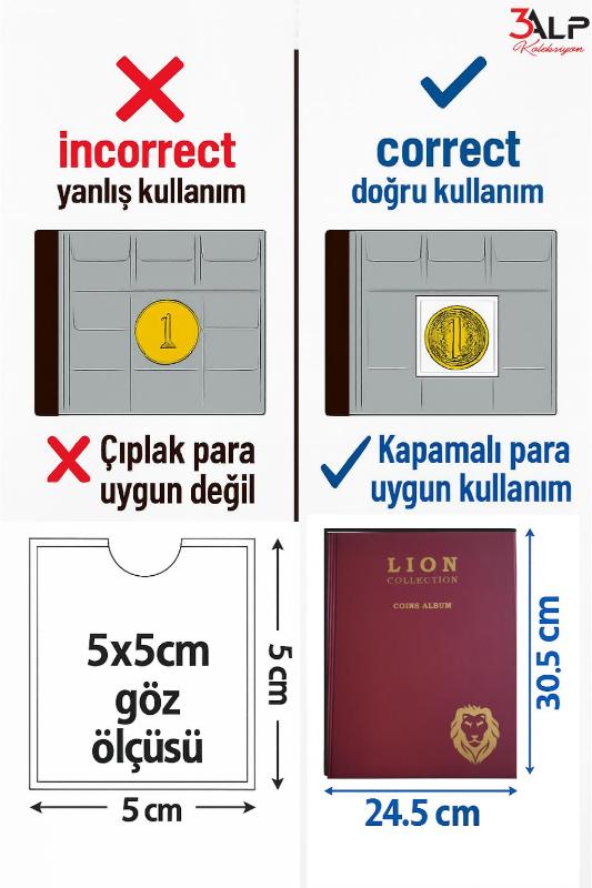Bu ürün 3Alp Koleksiyon güvencesiyle gönderilmektedir. Numismatik ve koleksiyon alanında uzmanlaşmış 3Alp Koleksiyon, farklı ülkelere ait koleksiyon ürünleri ve profesyonel saklama çözümleri sunmaktadır. Yeni ürünler ve özel seriler için markamızı takip edebilirsiniz. 3Alp Koleksiyon Lion 200 Gözlü Kapamalı Madeni Para Albümü Siyah Lion 200 Gözlü Kapamalı Madeni Para Albümü Koleksiyoncular için özel tasarlanan Lion Kapamalı Madeni Para Albümü , kapama içindeki madeni paraların güvenle saklanmasını sağlar. Her sayfada 20 göz olmak üzere toplam 10 sayfadan oluşur ve 200 adet kapamalı madeni para kapasitelidir. Ürün Özellikleri Sayfa Sayısı: 10 Her sayfada 20 göz Toplam Kapasite: 200 adet kapamalı madeni para Göz Ölçüsü: 5 cm x 5 cm (standart kapama boyutu) Albüm Ölçüleri: 30,5 cm (boy) x 24,5 cm (en) Kullanım Bilgileri Yalnızca kapamalı madeni paralar için uygundur. Kapamasız (çıplak) paralar albüme yerleştirilmemelidir. Avantajları Geniş 200 adet kapamalı madeni para kapasitesi Her sayfada 20 göz ile düzenli yerleşim Dayanıklı malzeme ve uzun ömürlü kullanım Koleksiyonunu güvenli ve şık biçimde saklama imkânı Paket İçeriği 1 adet Lion 200 Gözlü Kapamalı Madeni Para Albümü (boş sayfalar) Görsellerdeki madeni paralar ürüne dahil değildir.