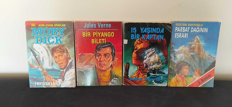 4 ADET ÇOCUK KİTABI.1-MOBİY DİCK, 2-BİR PİYANGO BİLETİ, 3- 15 YAŞINDA BİR KAPTAN,4-PARPAT DAĞININ ESRARI. ORJİNAL İKİNCİ EL KİTAP