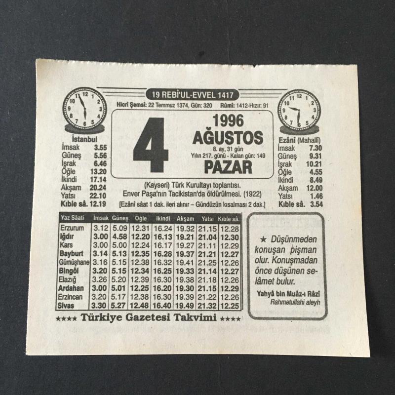 4 AĞUSTOS 1996 -TAKVİM YAPRAĞI-DOĞUM GÜNÜ HEDİYESİ-TÜRKİYE GAZETESİ TAKVİMİ,KAYSERİ TÜRK KURULTAYI TOPLANTISI,ENVER PAŞANIN TACİKİSTANDA ÖLDÜRÜLMESİ 1922,NAMAZ,TAKMA GÖZ,YOLCULUĞA ÇIKARKEN, en son 8 ay önce güncellenmiştir.