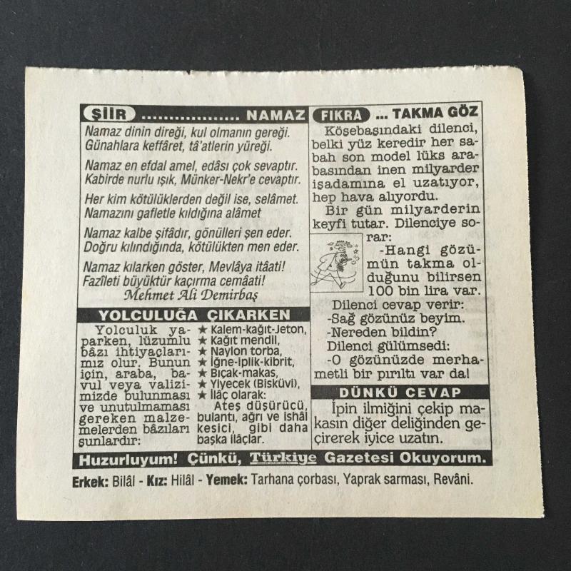 Gazeteler,dergiler,kitaplar harika hediyelerdir.Otantik,orijinal,nadir ve eski gazeteler,dergiler,kitaplar,efemeralar,objeler.Gazeteler bir aynadır.Kitaplar sadece okumak için değil birlikte yaşamak içindir . Kelimeler , notalar , sayılar kardeştirler.Kitaplar insanı binbir gözlü yapar.