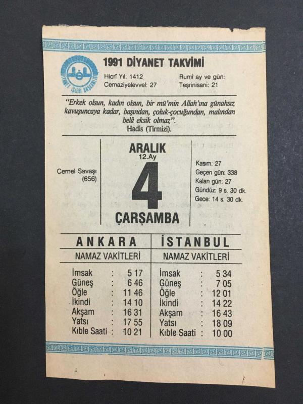 4 ARALIK 1991 -TAKVİM YAPRAĞI-DOĞUM GÜNÜ HEDİYESİ-DİYANET TAKVİMİ,CAMEL SAVAŞI 656,İLİM ADAMININ GEREKLİLİĞİ,ATASÖZLERİ, 1 yıl önce satışa sunulmuştur.