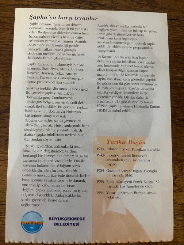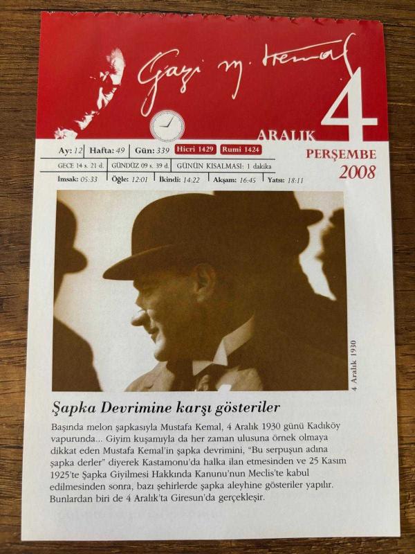 4 ARALIK 2008 - TAKVİM YAPRAĞI - DOĞUM GÜNÜ HEDİYESİ - GAZİ MUSTAFA KEMAL ATATÜRK FOTOĞRAFLI BÜYÜKÇEKMECE BELEDİYESİ TAKVİMİ - Şapka Devrimine karşı gösteriler - Şapka'ya karşı isyanlar - 1933- Eskişehir Şeker Fabrikası kuruldu - 1983- Gazeteci yazar Doğan Avcıoğlu 57 yaşında öldü - 1993- Rock müzisyeni Frank Zappa, 52 yaşında Los Angeles'de öldü - 1994- Yazar, çevirmen Burhan Arpad vefat etti, 5 ay önce satışa sunulmuştur.