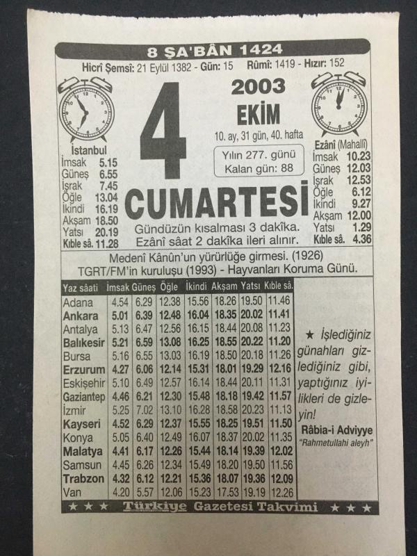 4 EKİM 2003-TAKVİM YAPRAĞI-DOĞUM GÜNÜ HEDİYESİ-TÜRKİYE GAZETESİ TAKVİMİ,MEDENİ KANUNUN YÜRÜRLÜĞE GİRMESİ,1926,TGRT FM İN KURULUŞU 1993 HAYVANLARI KORUMA GÜNÜ,2.ABDULHAMİD İN İMZASI başlıklı ürün, Efemera, Müzik, Sinema > Belge ve Evraklar > Takvimler kategorisi altında İkinci El olarak satılmaktadır.