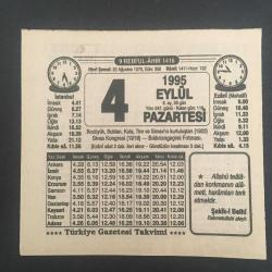 4 EYLÜL 1995 -TAKVİM YAPRAĞI-DOĞUM GÜNÜ HEDİYESİ-TÜRKİYE GAZETESİ TAKVİMİ,BOZÜYÜK,BULDAN,KULA,TİRE,SİMAVIN KURTULUŞLARI 1922,SİVAS KONGRESİ,1919,BILDIRCINGEÇİMİ FIRTINASI,ABD DEN MEKTUP başlıklı ürün, Efemera, Müzik, Sinema > Belge ve Evraklar > Takvimler kategorisi altında İkinci El olarak satılmaktadır.