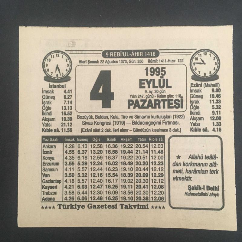 4 EYLÜL 1995 -TAKVİM YAPRAĞI-DOĞUM GÜNÜ HEDİYESİ-TÜRKİYE GAZETESİ TAKVİMİ,BOZÜYÜK,BULDAN,KULA,TİRE,SİMAVIN KURTULUŞLARI 1922,SİVAS KONGRESİ,1919,BILDIRCINGEÇİMİ FIRTINASI,ABD DEN MEKTUP, en son 8 ay önce güncellenmiştir.
