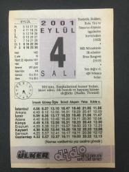 4 EYLÜL 2001-TAKVİM YAPRAĞI-DOĞUM GÜNÜ HEDİYESİ-ÜLKER TAKVİMİ,BOZÜYÜK,BULDAN,KULA,TİRE,VE SİMAVIN DÜŞMAN İŞGALİNDEN KURTULUŞLARI 1922,SİVAS KONGRESİ 1919,AĞIZ SAĞLIĞI DİŞLER, en son 8 ay önce güncellenmiştir.